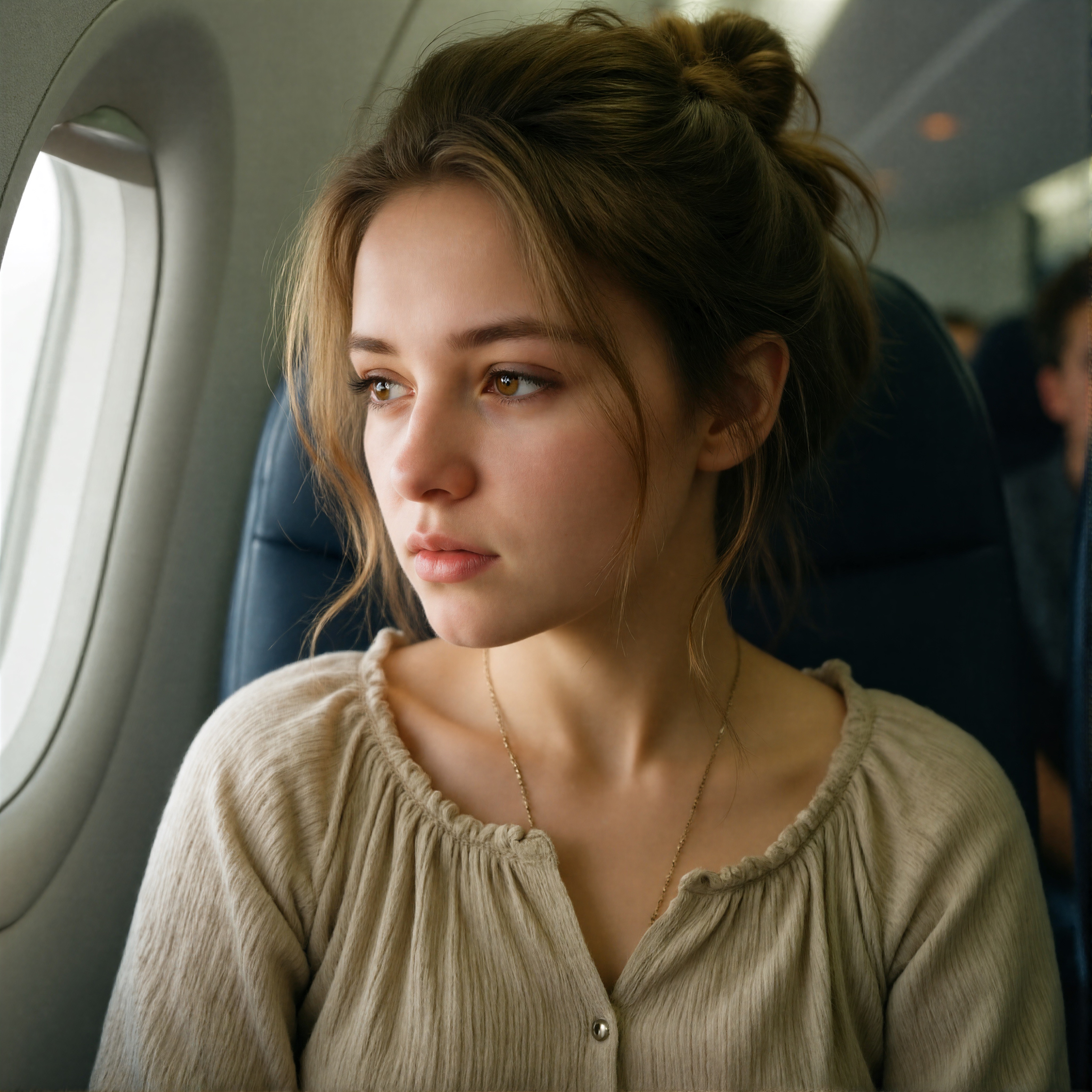 Rain smeared the windows into watercolour. The moment we stopped rolling, half the plane stood up like standing would summon the exit faster. Sarah stayed seated. She exhaled through her nose, eyes on her phone, unbothered by other people’s impatience.