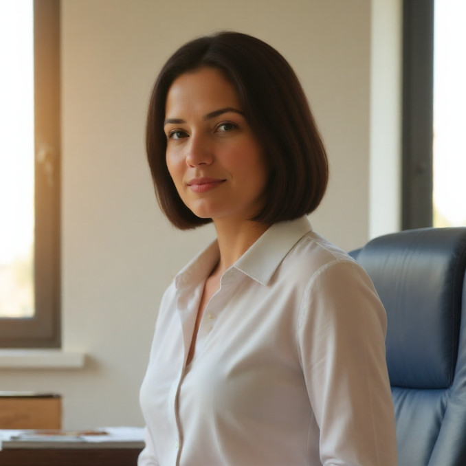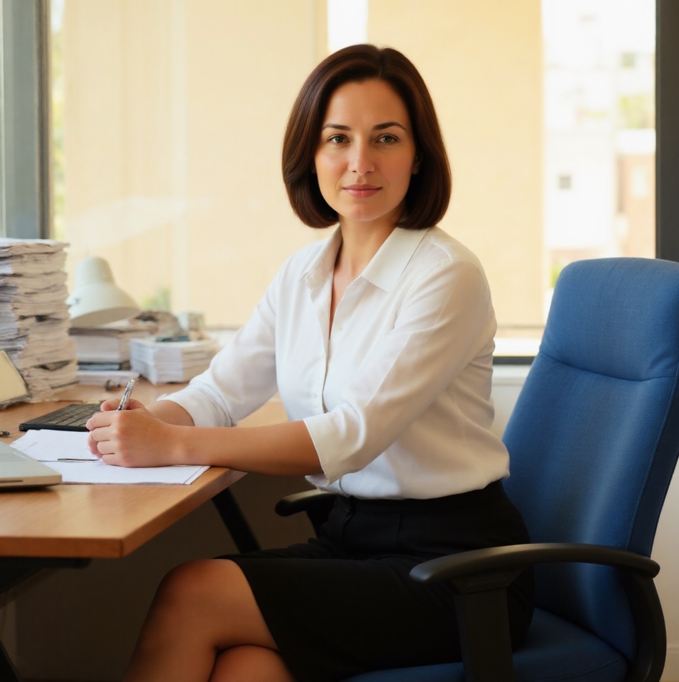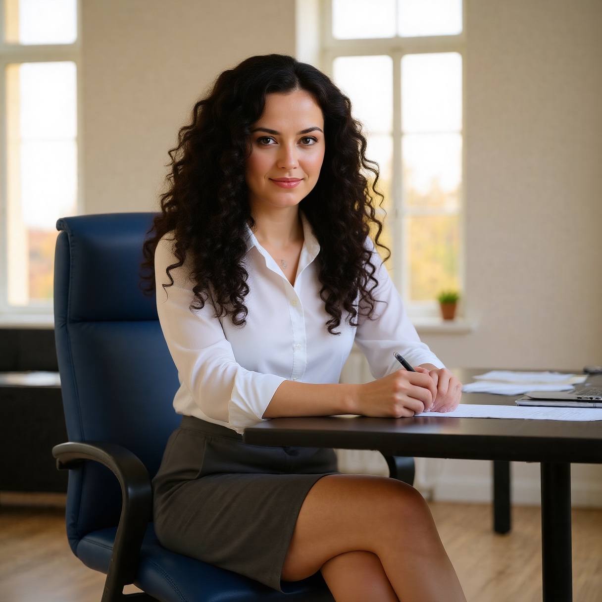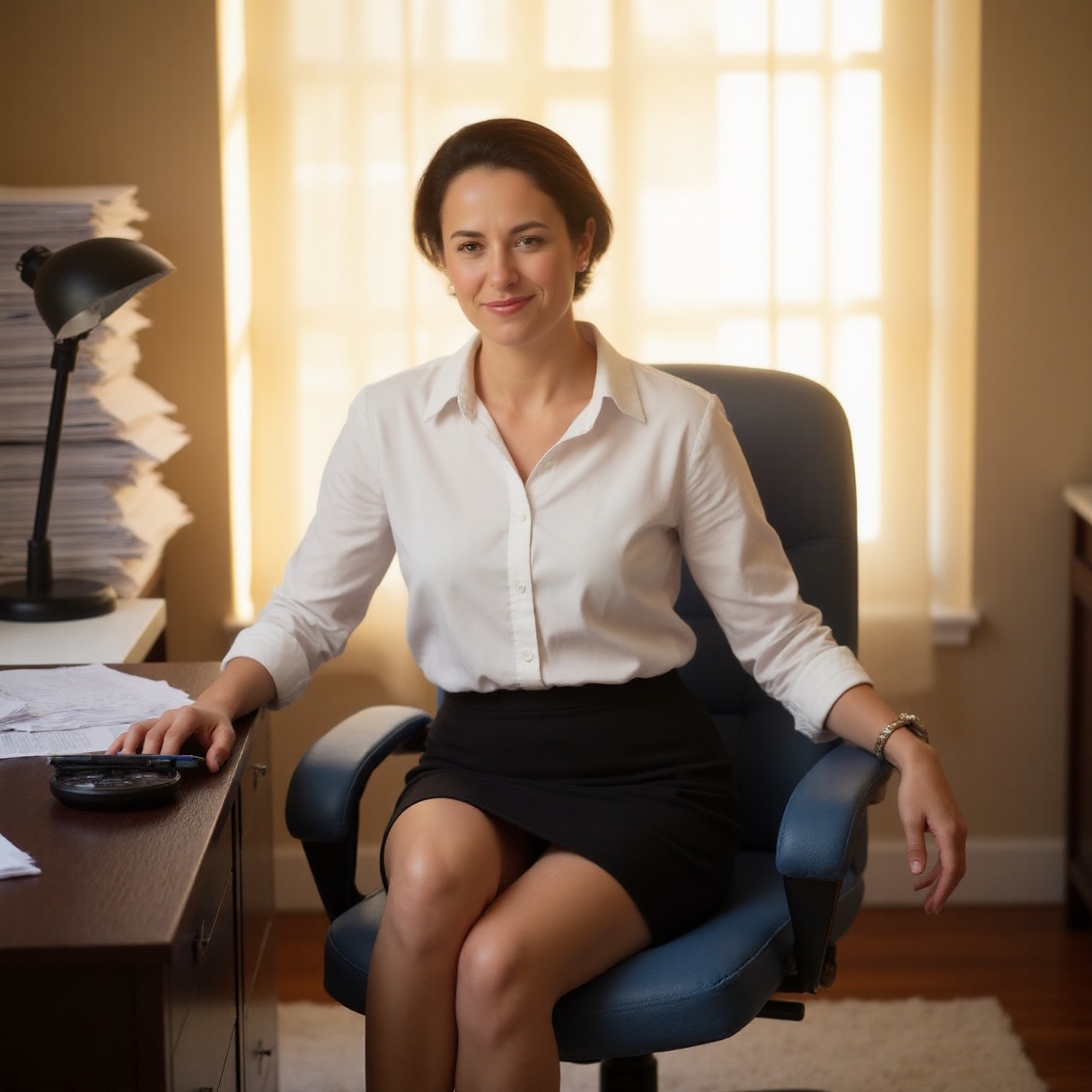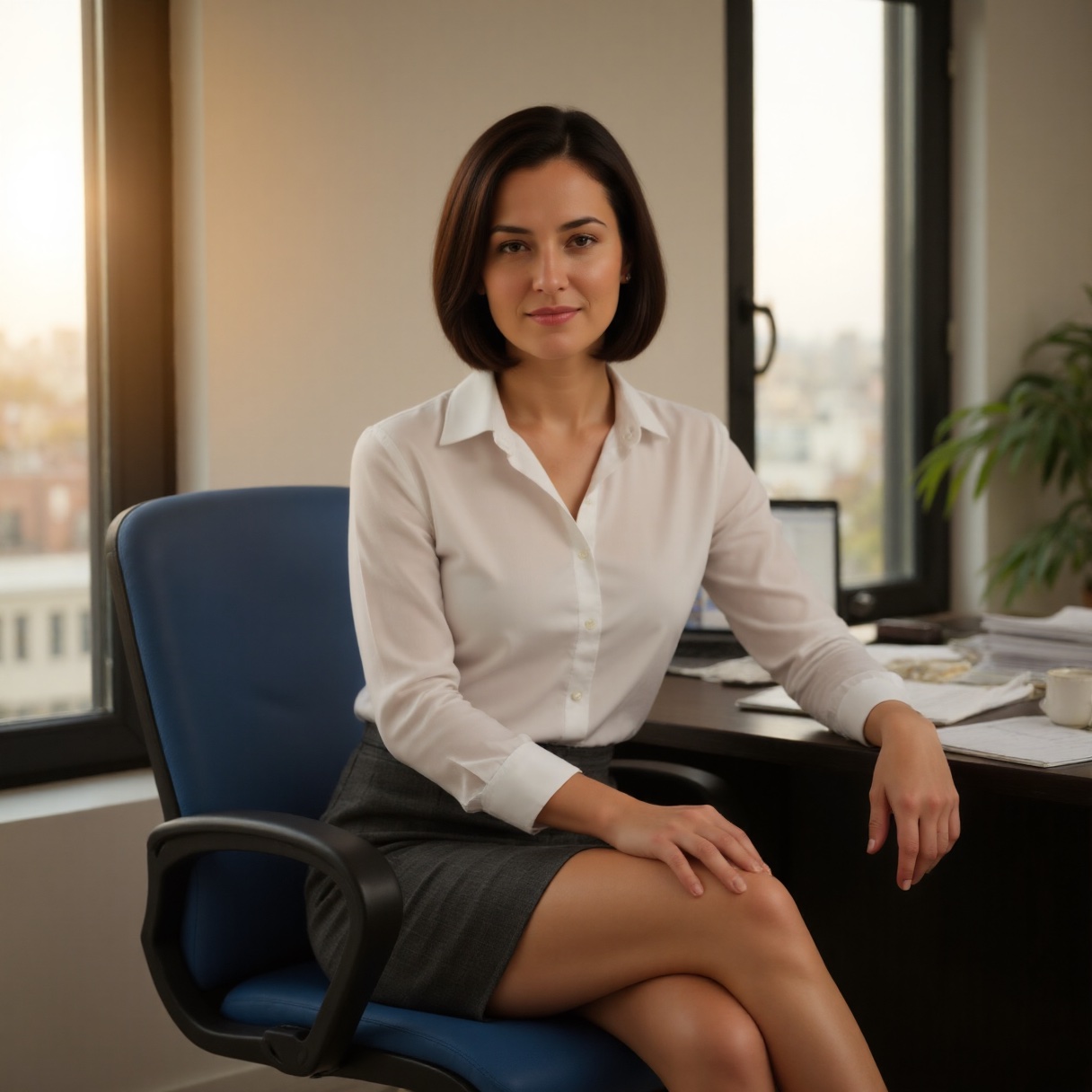 A digital artwork featuring a confident woman seated at an office desk in a sunlit room. She has short black hair, fair skin, and is wearing a white button-down blouse with the sleeves rolled up to her elbows, and a form-fitting dark gray skirt. Her legs are crossed, showcasing her toned thighs, and she wears black high-heeled shoes. The woman holds a pen in her right hand, resting it on the desk, which is cluttered with papers, a laptop, and office supplies. She sits on a blue leather office chair with armrests, positioned slightly to the left of center. Behind her are two tall windows letting in bright sunlight, casting warm yellow and orange hues throughout the room. The walls are light-colored, contrasting with the dark furniture. The overall style is hyper-realistic with a strong use of light and shadow, emphasizing the woman's confident demeanor and professional setting. Her expression is serious yet composed, and she exudes authority and competence. The image has a slight vignette effect, drawing focus to her as the central figure.