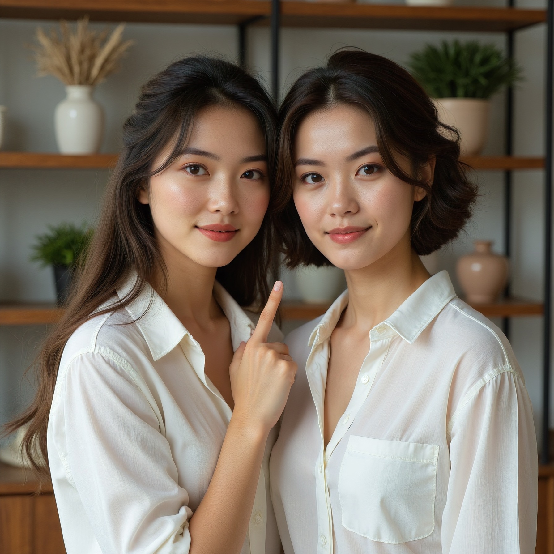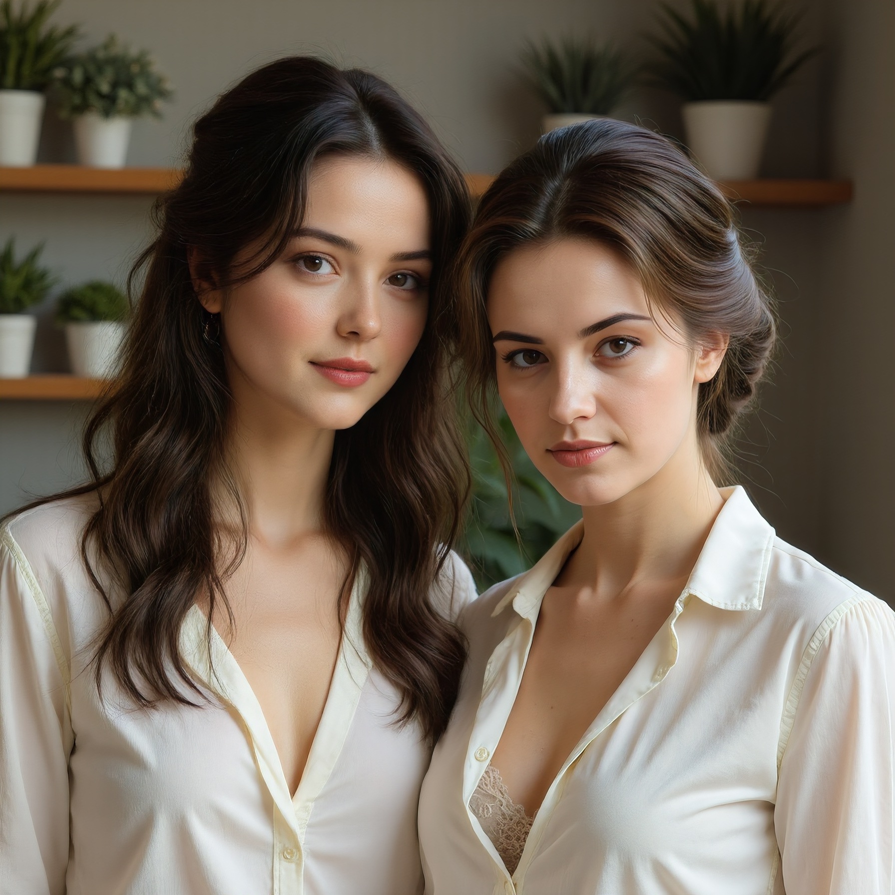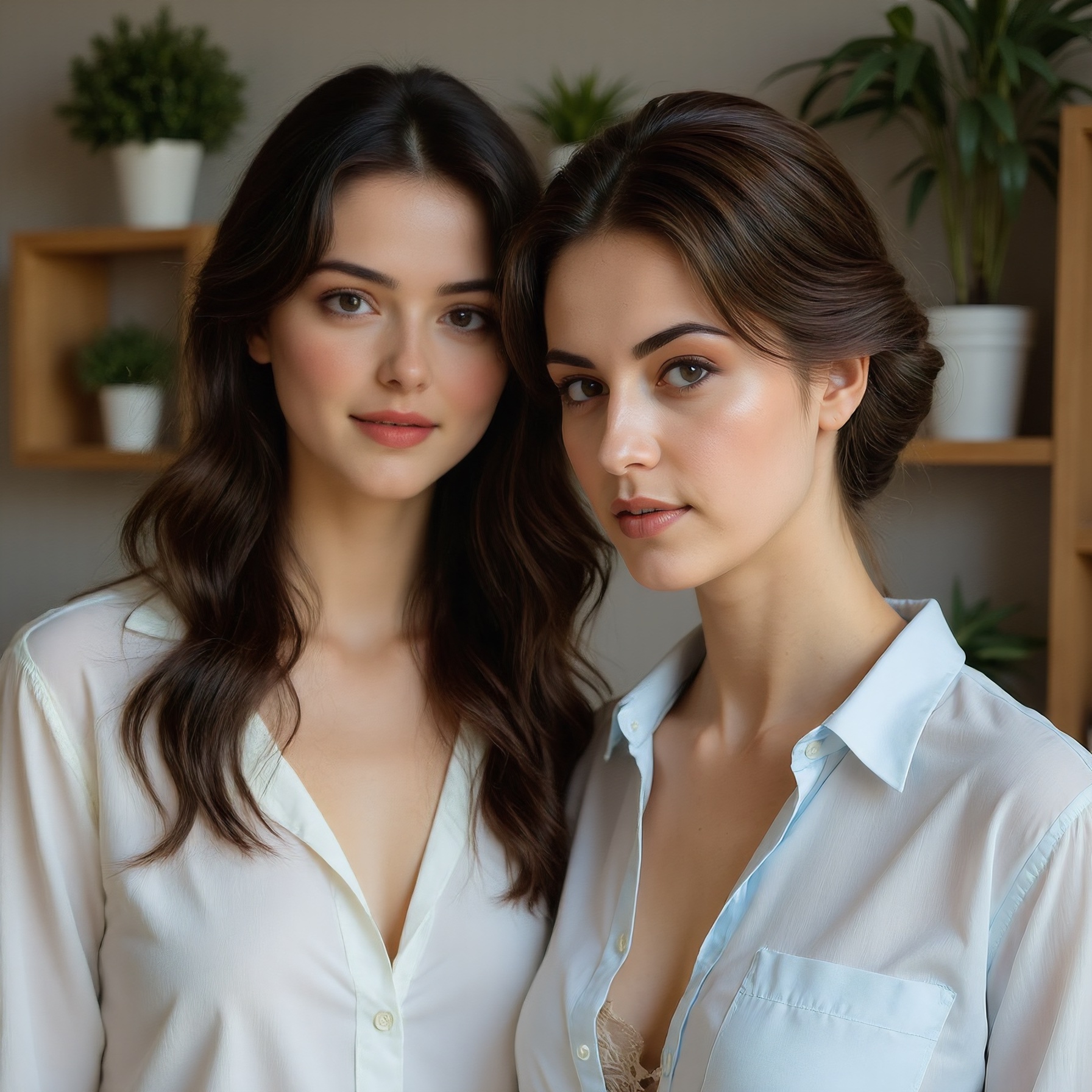 This photograph depicts two women standing side by side indoors against a backdrop of wooden shelves holding potted plants and decorative vases. Both women have light to medium skin tones and are wearing white button-up shirts with the tops partially unbuttoned, exposing their collars and some chest areas.