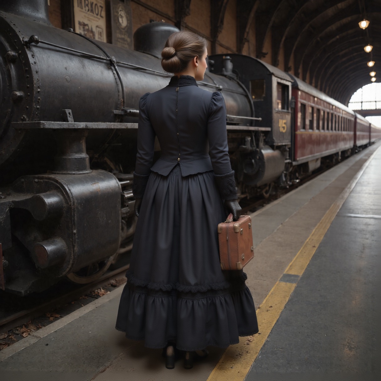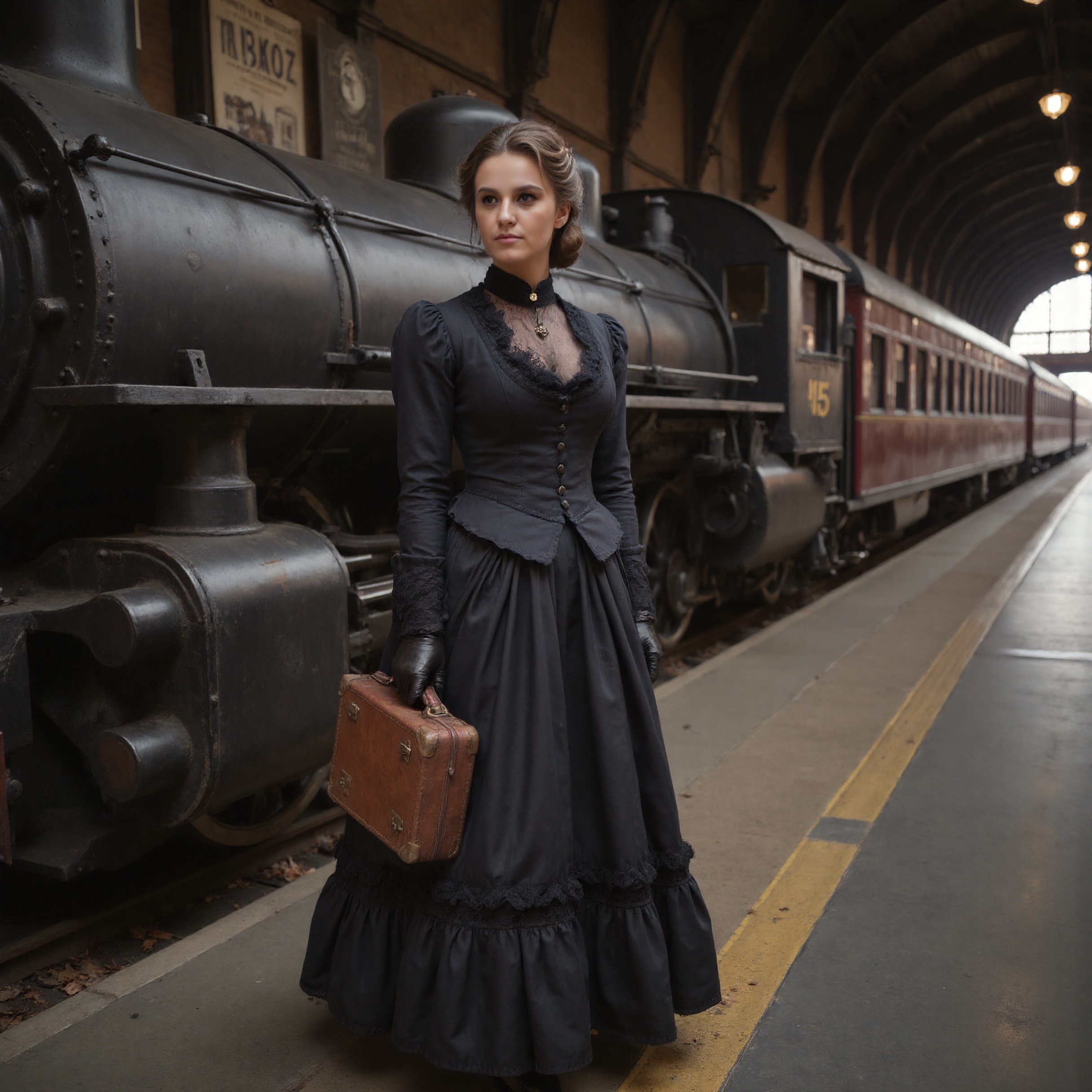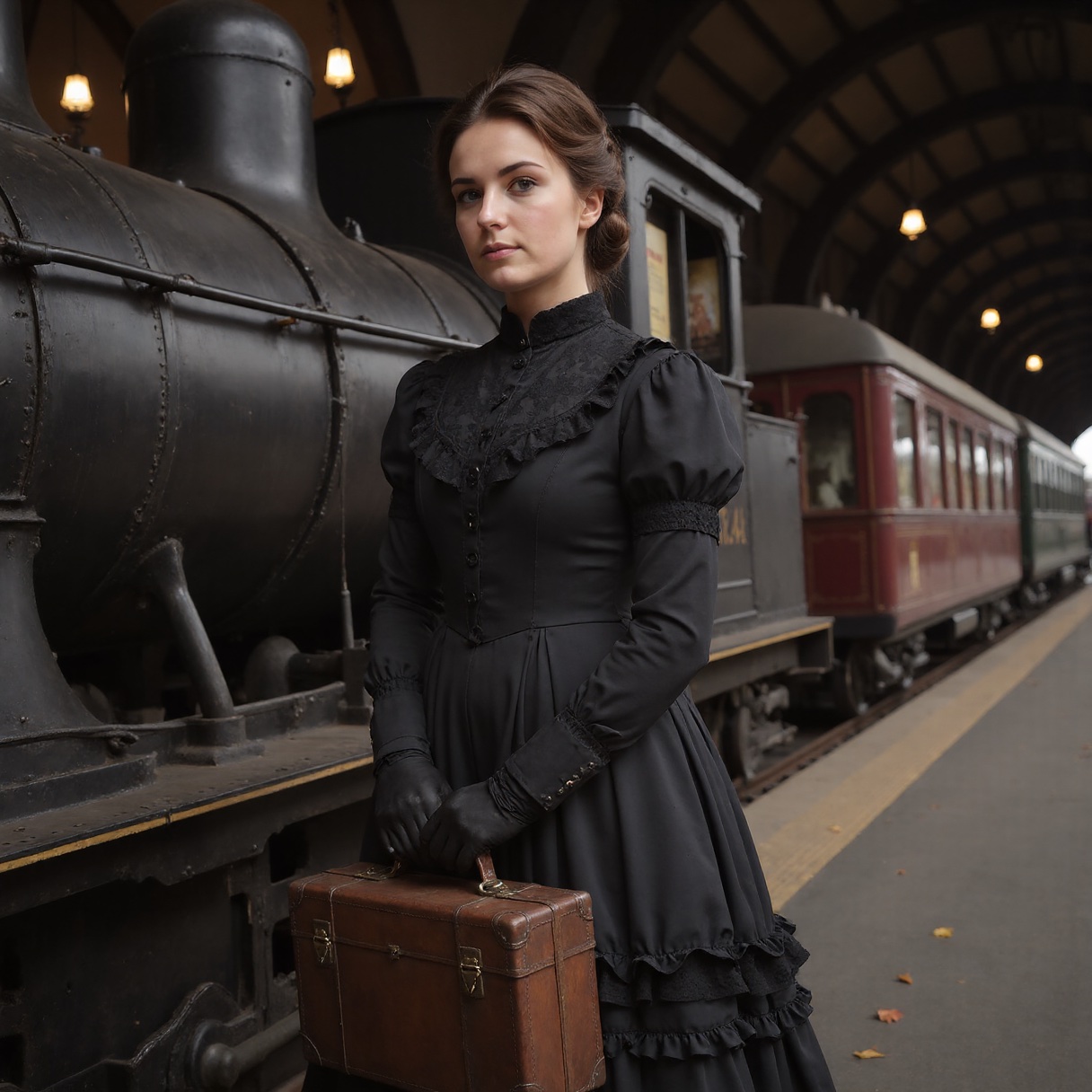 "The photograph depicts a Victorian-era woman standing next to an old steam train. moimeme3 She has fair skin, light brown hair styled in a loose updo. Her dress is long-sleeved, black with intricate lace details on the bodice and sleeves, and it features multiple layers of ruffled fabric at the hem covering her shoes so they are barely visible. The dress buttons up the front and she wears black gloves that reach her upper arms. She holds an aged brown leather suitcase with metal clasps and a slightly worn appearance by the handle with her gloved hand. Her facial expression is serious and slightly contemplative. The steam train beside her has a dark metallic exterior with visible rivets and numbers "15" on the side. In the background, another car of the train is visible, painted in maroon with yellow accents. The background shows a dimly lit train station with arched ceilings and hanging lights. The walls are lined with dark wooden panels and vintage posters. The platform extends into the distance, fading into bright light at the far end. A yellow safety line is visible near the edge of the platform. Fallen leaves scatter on the ground beside her. The overall mood is gothic and melancholic, with a sense of timelessness. The photograph emphasizes textures such as the lace of her dress, the polished wood of the station, and the aged leather suitcase. The woman's expression is slightly pensive, adding to the somber atmosphere. The image combines elements of historical fashion with a modern photographic style. The overall color palette of the image includes muted blacks, browns, and grays, with subtle highlights from the golden brooch and metallic elements of the train. The photograph has a slightly dark and moody tone, emphasizing the Victorian era setting. The textures in the image are rich, particularly in the woman's dress fabric and the old leather suitcase."