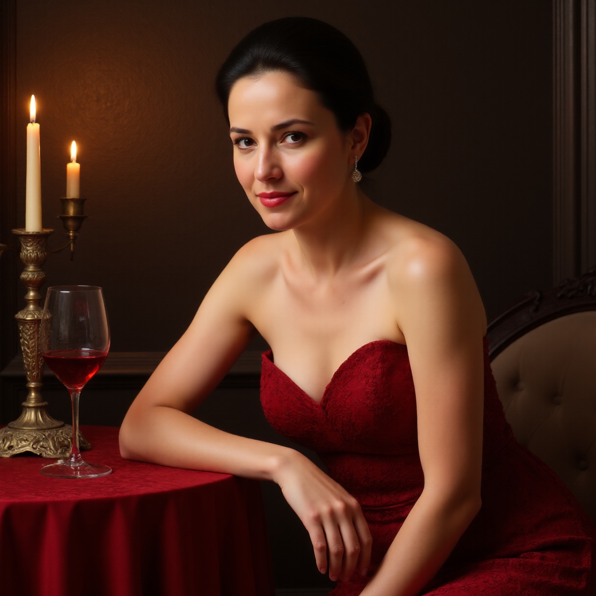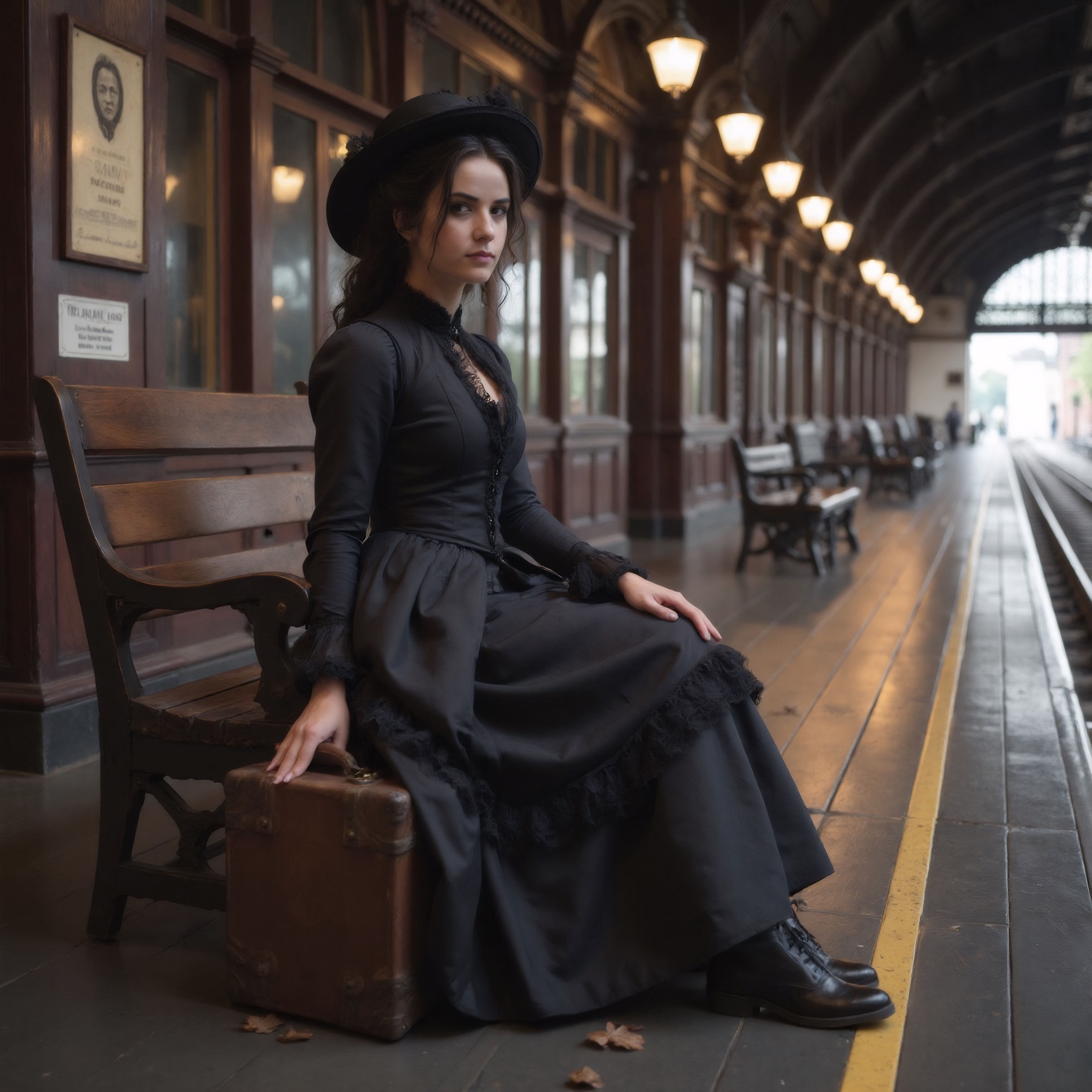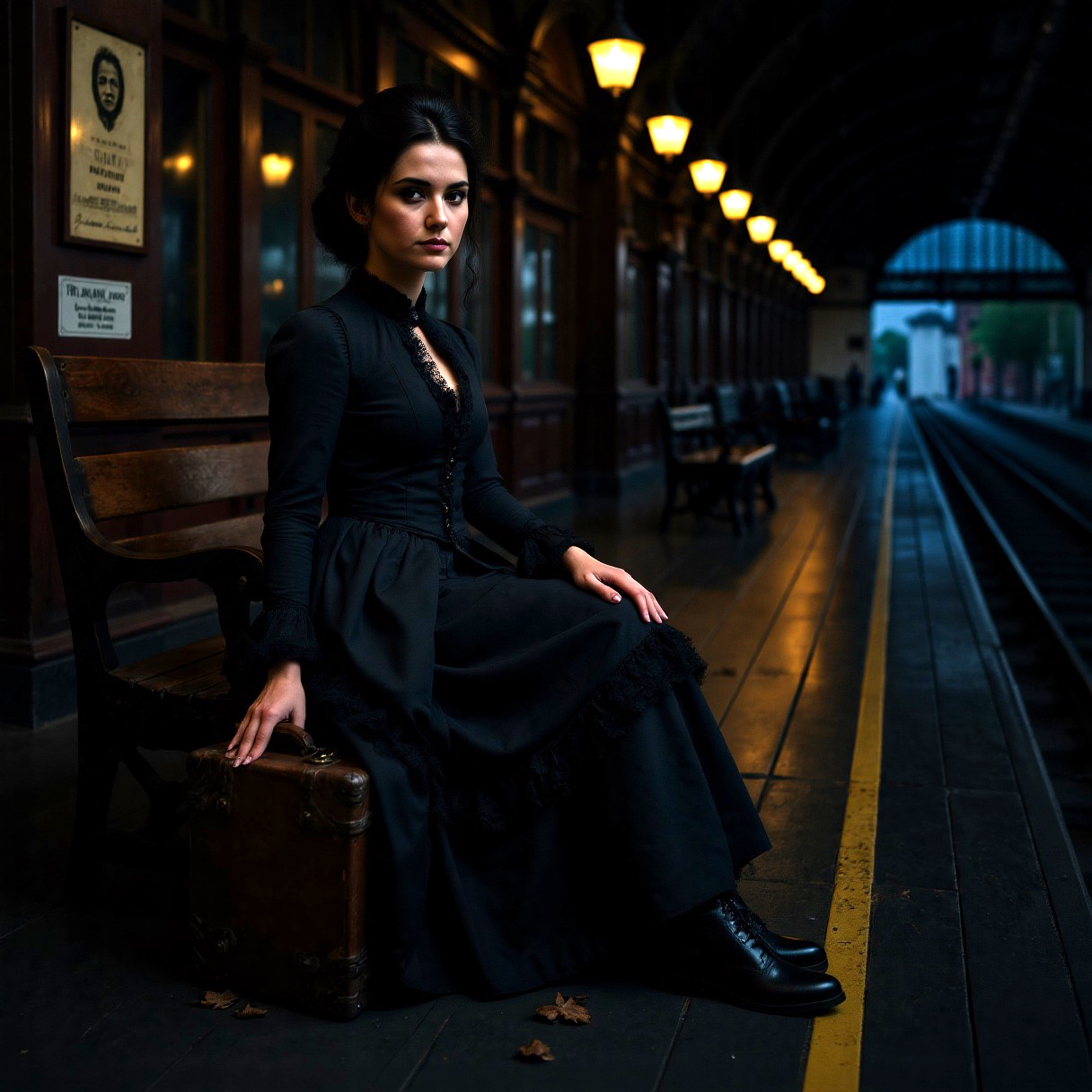 "The photograph depicts a Victorian-era woman standing next to an old steam train. moimeme3 She has fair skin, light brown hair styled in a loose updo. Her dress is long-sleeved, black with intricate lace details on the bodice and sleeves, and it features multiple layers of ruffled fabric at the hem covering her shoes so they are barely visible. The dress buttons up the front and she wears black gloves that reach her upper arms. She holds an aged brown leather suitcase with metal clasps and a slightly worn appearance by the handle with her gloved hand. Her facial expression is serious and slightly contemplative. The steam train beside her has a dark metallic exterior with visible rivets and numbers "15" on the side. In the background, another car of the train is visible, painted in maroon with yellow accents. The background shows a dimly lit train station with arched ceilings and hanging lights. The walls are lined with dark wooden panels and vintage posters. The platform extends into the distance, fading into bright light at the far end. A yellow safety line is visible near the edge of the platform. Fallen leaves scatter on the ground beside her. The overall mood is gothic and melancholic, with a sense of timelessness. The photograph emphasizes textures such as the lace of her dress, the polished wood of the station, and the aged leather suitcase. The woman's expression is slightly pensive, adding to the somber atmosphere. The image combines elements of historical fashion with a modern photographic style. The overall color palette of the image includes muted blacks, browns, and grays, with subtle highlights from the golden brooch and metallic elements of the train. The photograph has a slightly dark and moody tone, emphasizing the Victorian era setting. The textures in the image are rich, particularly in the woman's dress fabric and the old leather suitcase."