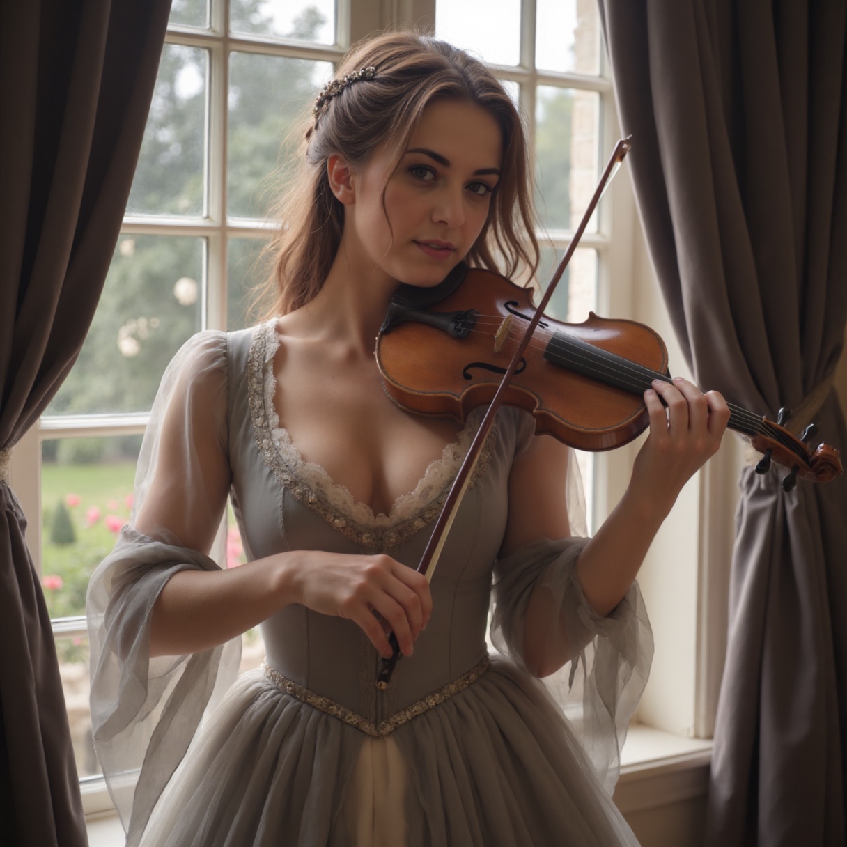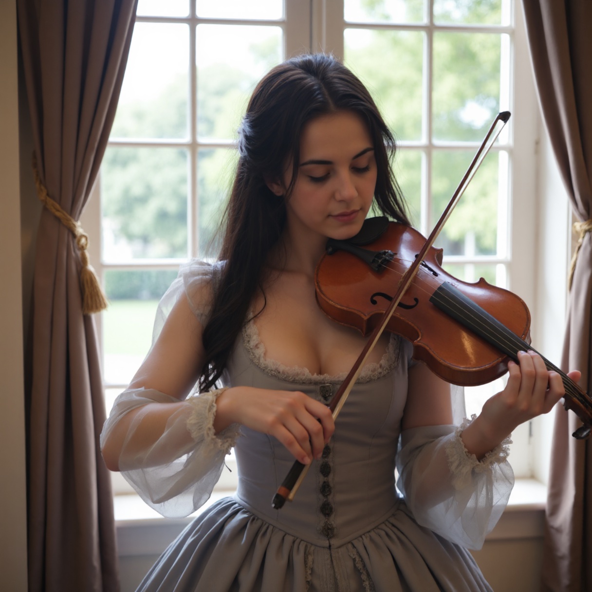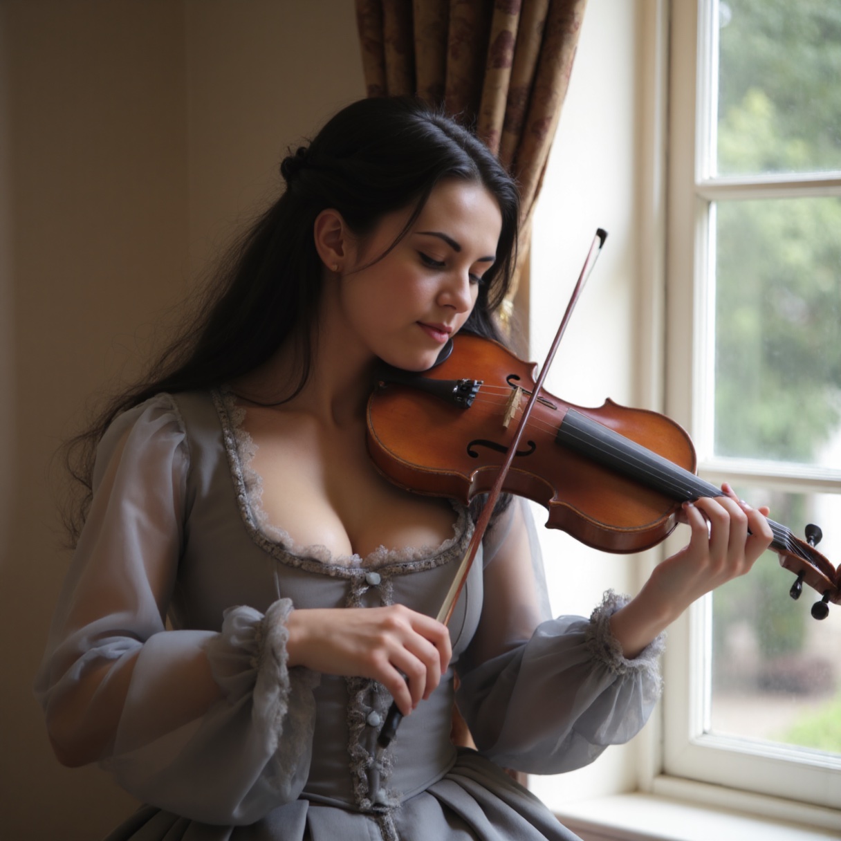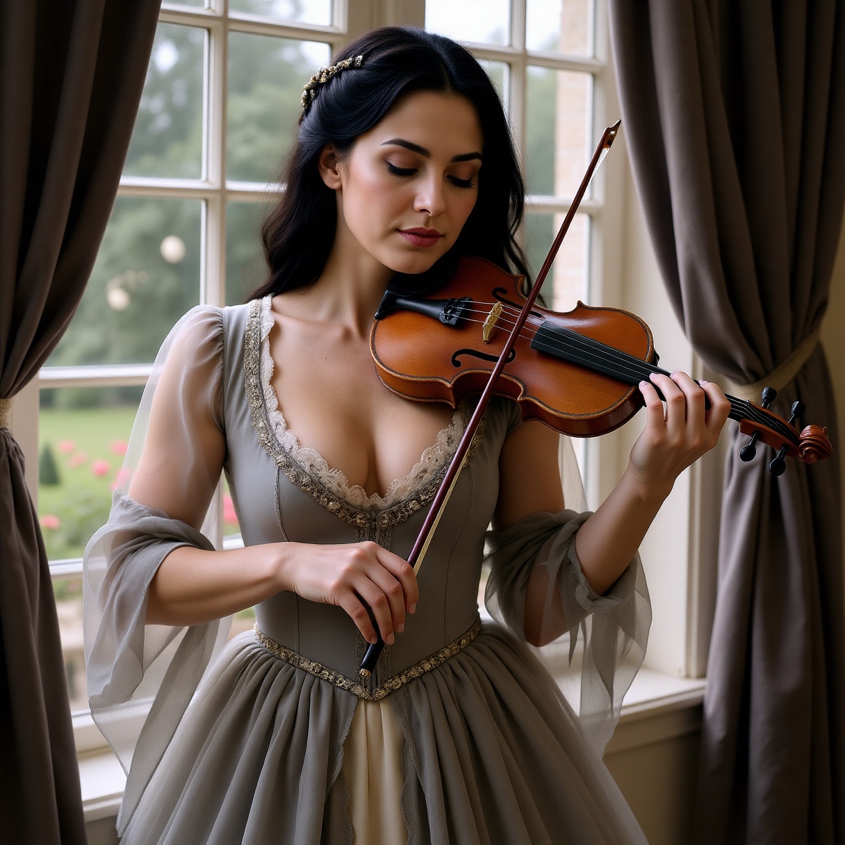 A photograph of a young woman with long black hair playing a violin indoors. She has fair skin and is wearing an elegant gray dress with a deep V-neckline adorned with silver lace trim, and sheer, bell-shaped sleeves. The dress has a flowing skirt with a slightly gathered waist. She holds the violin delicately in her right hand while drawing the bow with her left hand, her eyes gently closed as she focuses on playing. The background shows a large window with white panes and brown curtains tied back with golden cords. Outside, there is a blurred view of greenery and sunlight filtering through the glass. The overall style is romantic and classical, evoking an old-world charm. The lighting is soft and natural, highlighting her delicate features and the rich color of the violin. The woman appears serene and focused, embodying a sense of grace and musical dedication. The image conveys a peaceful, intimate atmosphere with its warm, gentle colors and elegant composition. This detailed description should provide a clear understanding of the photograph for someone who cannot see it visually.