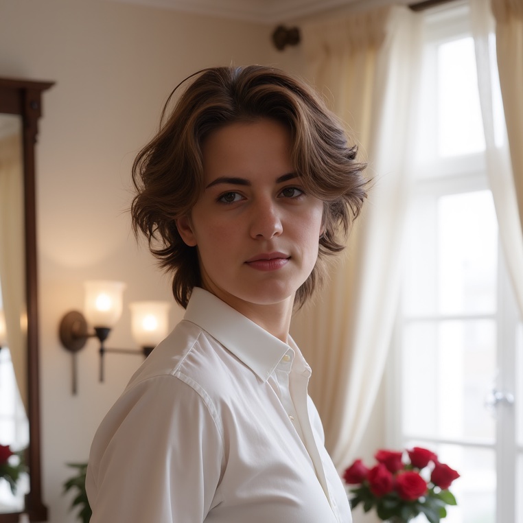 "A portrait of a short somber 16yo youth with long wavy messy brown hair. moimeme3 The person is wearing a fitted white cotton shirt with sleeves turned up and baggy jeans. The person is in a hairdressing salon. He is sweeping up from around the salon chairs. His hair is messy. Background is a room with pale white curtains on the windows and mirrors and roses in vases. Ultra-high detail, photorealistic rendering, sharp focus on on the fine textures on the hair, and rich environmental depth."