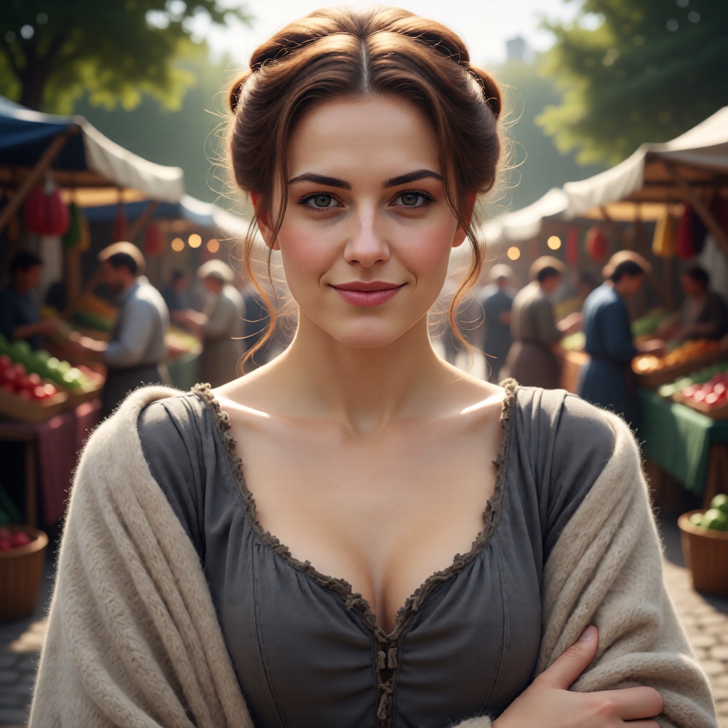 Okay, how about a change in the background: summertime in an open-air market? And, the hair? A Victorian updo. Change the prompt, and you get output that is truly uncanny ... because the model actually obeys the prompt.