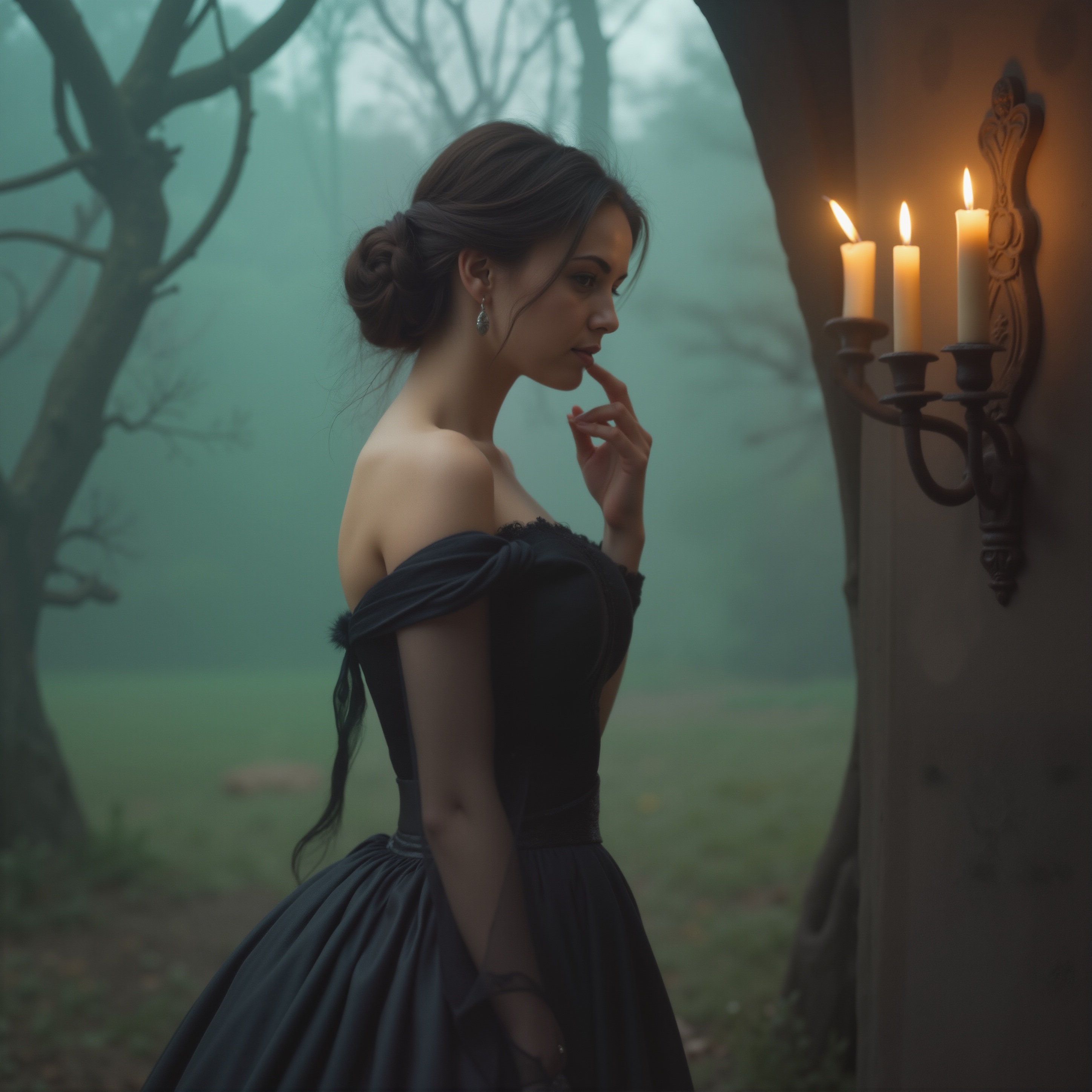 Change the hair style to tied back Low Updo hair. Change the dress to dark green Victorian dress with fitted bodice and square neckline with lace trim and the neckline. Preserve the woman's hands pose.