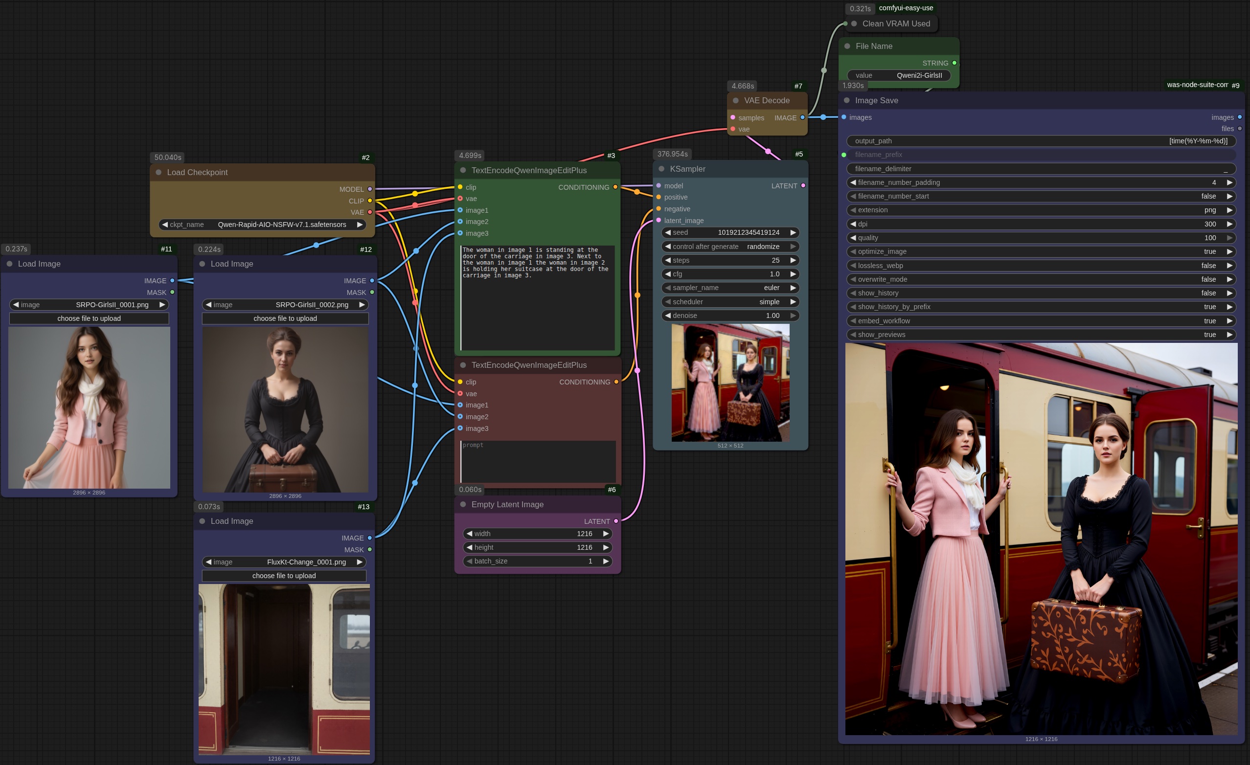 I'm revisiting all my old renders, doing some of them over. And of course, whilst I was going a dewy-eyed about this workflow, a new flavour of Qwen Image Edit -- All-In-One -- has dropped. It is impossible to keep up. Here I was trying to build this elaborate 2-character workflow, and Qwen already has it all mapped out: you can combine 2, 3 and even 4 images together. Makes my little dual-consistent-character effort obsolete. Qwen Image Edit All-In-One will be easier, higher quality and much faster to get an image.
