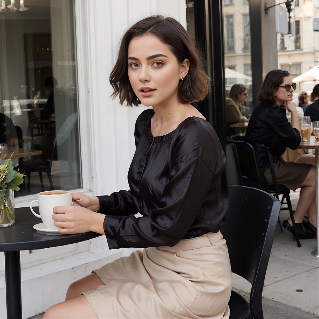 On the right, same basic image, but providing more detail: SRPO requires detail. More is better: This photograph, full body shot, front view, features elegant beautiful Nordic young woman "moimeme4". She is wearing a beige Rhea blouse, a black silk skirt and beige high heels. Her dark brown hair is styled a short bob hair. Her expression is open mouthed with her head tilted, holding a coffee cup. She is sitting at cafe table at an outdoor cafe. The scene is Au Deux Maggots in the Latin Quarter in Paris. It is a blustery November morning with lots of wind blowing her hair. The lighting is morning bright outdoor sunshine. Leaves are visible on the sidewalk outside the cafe.