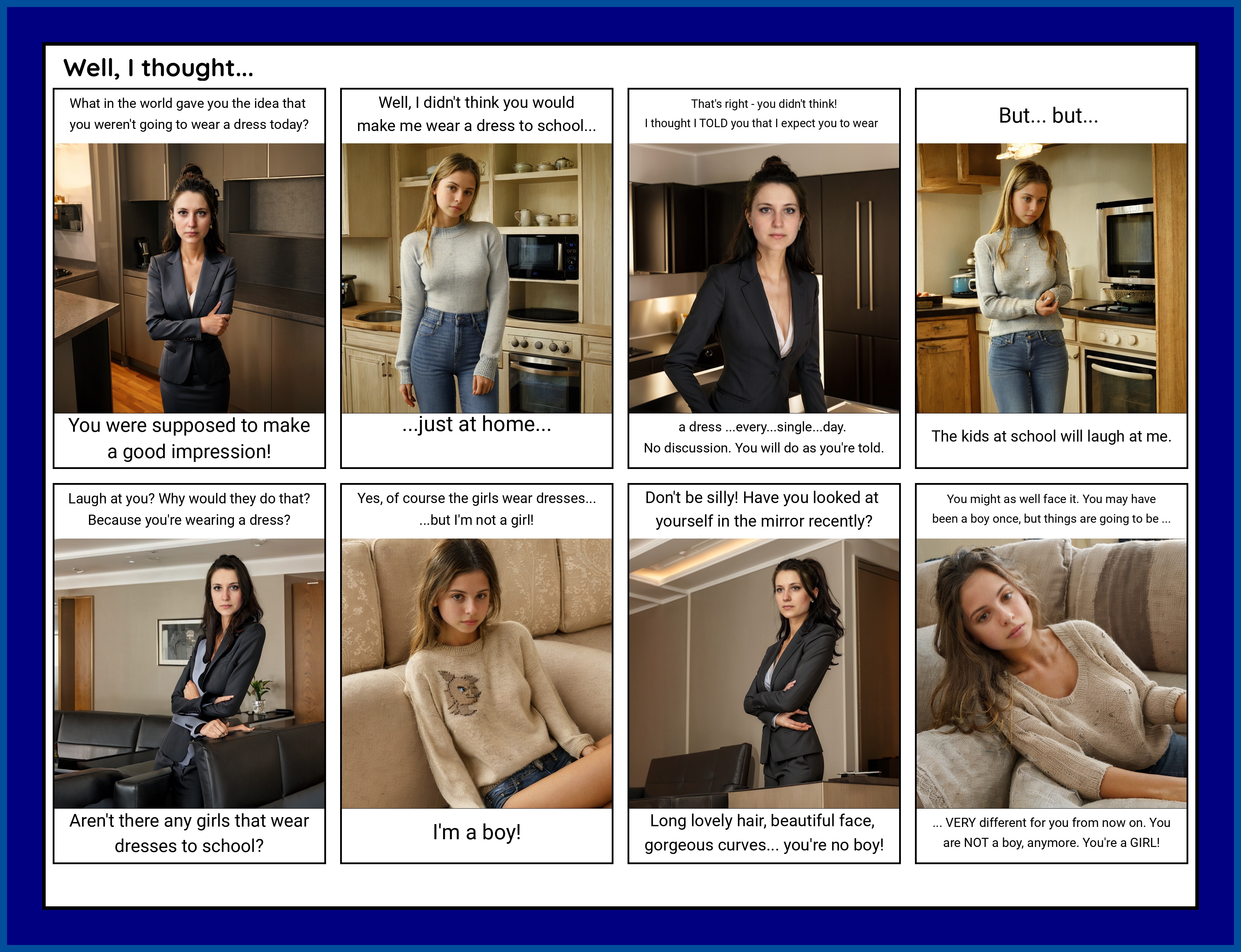 Changed the room colour to baby-blue -- that pink was a bit over-the-tip -- and gave Celeste a more realistic figure. I've noticed that it takes a model several goes with a new prompt to actually start implementing the changes. Changing 'slender but shapely' to just 'shapely' isn't going to take straight-away. Also, changes in the prompt seem to affect the LoRA's effectiveness: the characters become generic for a render or two.