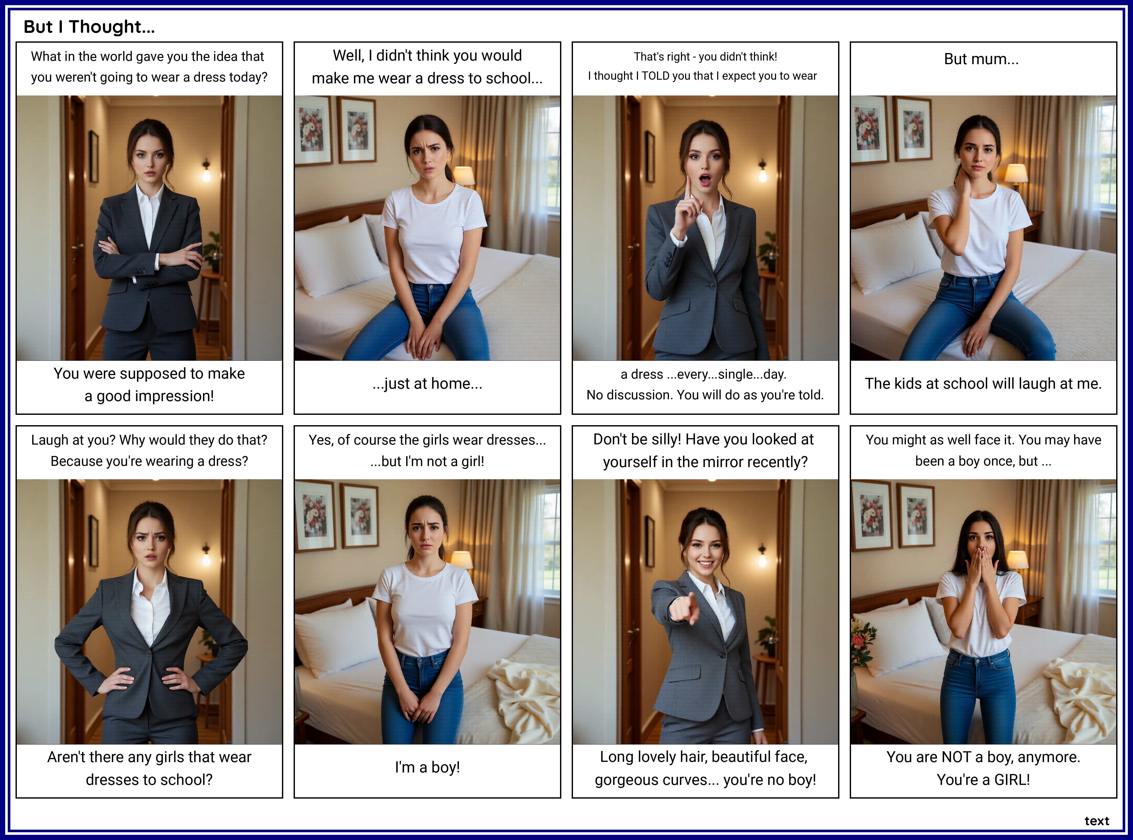 We're now 23 renders in - they each take upwards of 2 minutes on a 16 gig VRAM system - and we've gone from cotton slacks to leather slacks (aren't satin slacks a thing?); the outstretched hand finally happens; 'moimeme' never really looks worried or concerned (maybe she hides it well). Also, the only one "looking into eyes" is 'moimeme', who wasn't instructed to: Celeste was, who doesn't.
