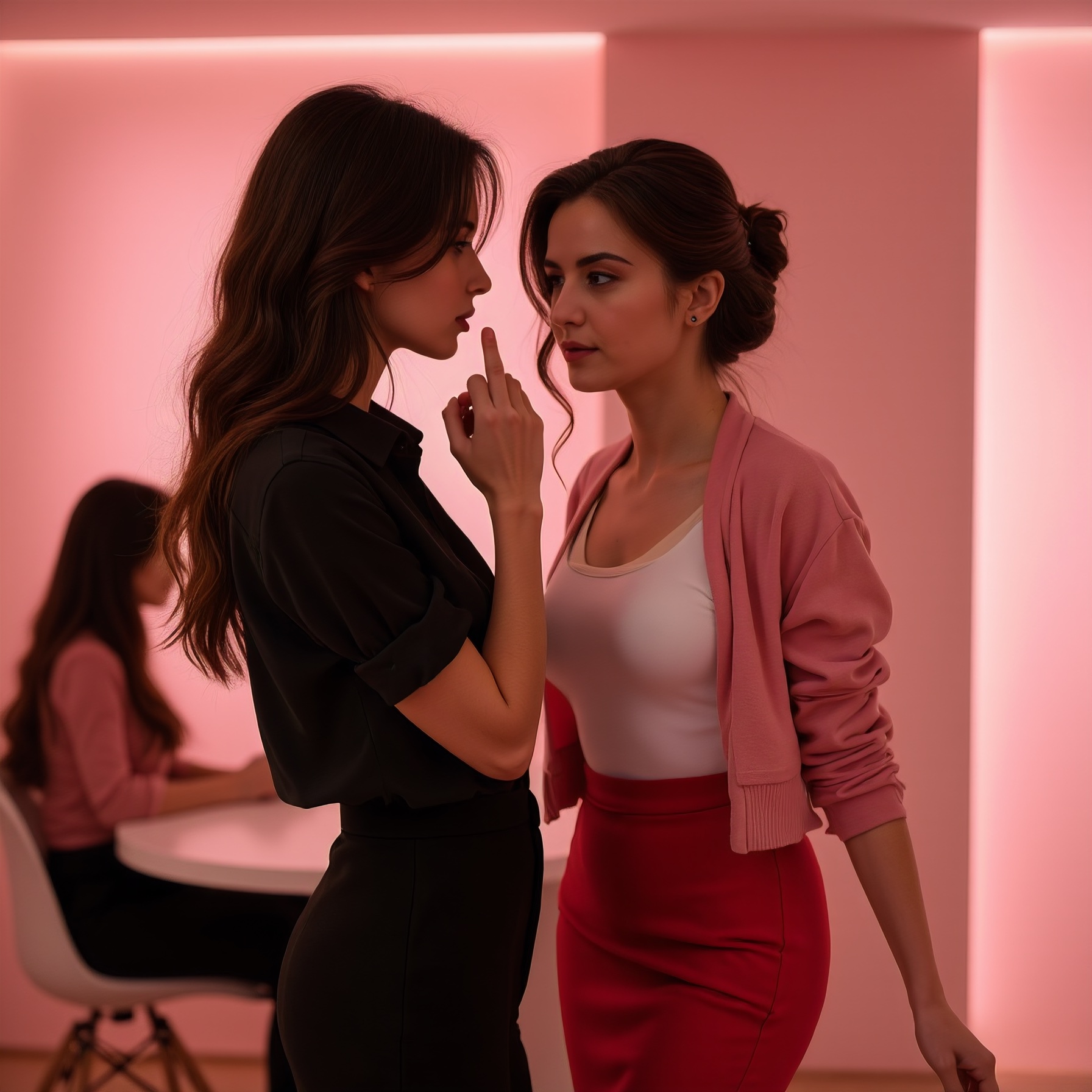 This photograph captures a provocative interaction between two women in a softly lit baby-blue-walled room. 1st woman "moimeme3", on the right, young, has light skin, brown hair in an updo, and is wearing a fitted white tank top paired with a pink cardigan and high-waisted red mini skirt that emphasizes her curvy physique and medium-sized breasts. She also wears black ankle-strap heels, giving a sleek, professional vibe to her outfit. 1st woman's expression is concern and worry, head tilted to one side. In the blurred background, there are two other women seated at a table, engaged in conversation and adding depth to the scene. The room has a light blue hue which contrasts against their darker outfits, and the textures of the wall and floor are smooth, indicative of modern design elements. Overall, the photograph creates a provocative, intimate atmosphere, emphasizing power dynamics through subtle, suggestive details. 2nd woman is the dominant woman. This photograph captures a provocative interaction between two women in a softly lit baby-blue-walled room. 2nd woman "celestesh", on the left, has medium skin and long brown hair falling past her shoulders. She is dressed in an all-black ensemble comprising of a button-up silk shirt and shiny, glossy black satin slacks with a rear zipper that highlight her shapely figure. She stretches out her hand at 1st woman in a supplicant manner, while gazing intently into 1st woman's eyes. This act of intimate interaction exudes a sense of dominance over 1st woman.