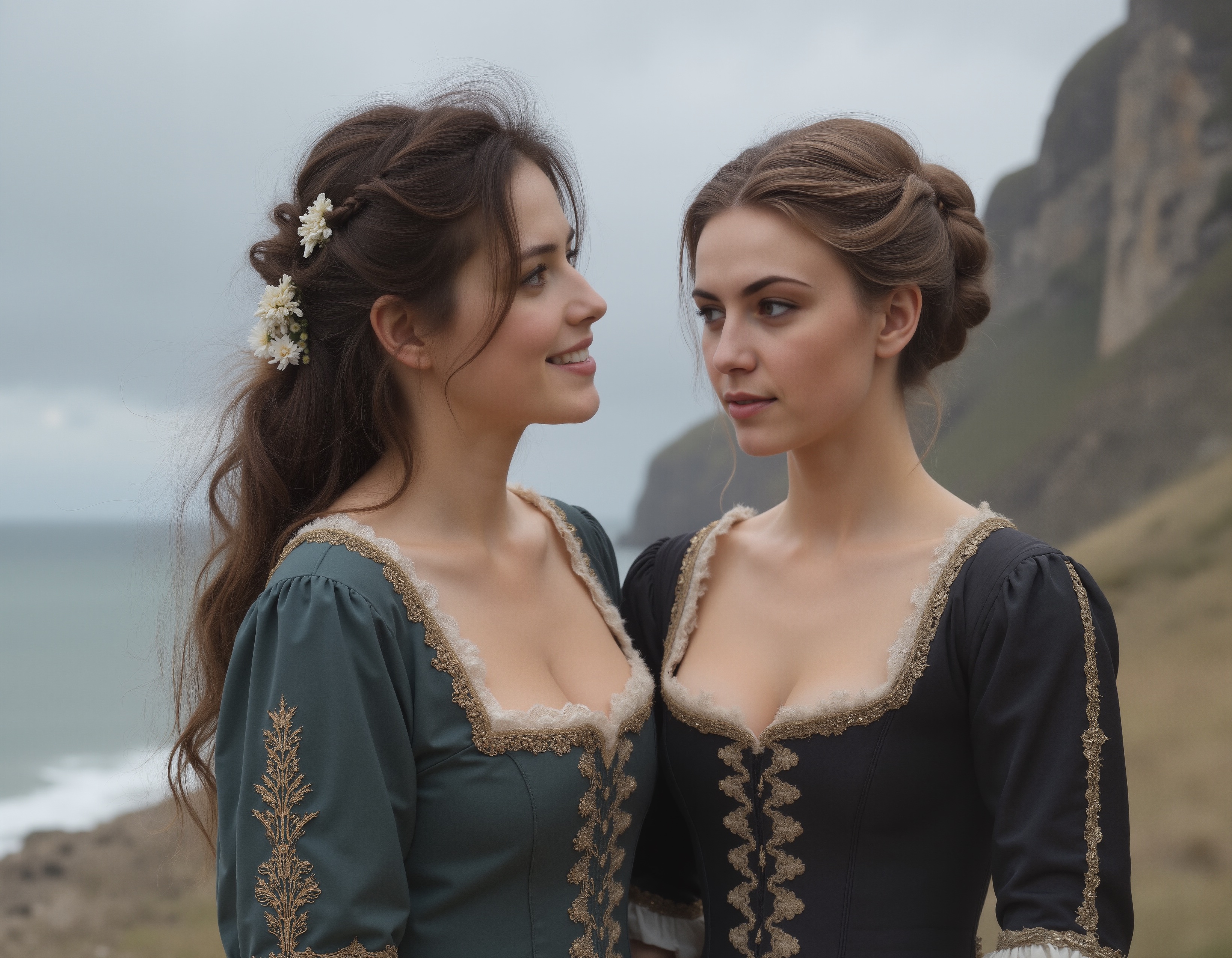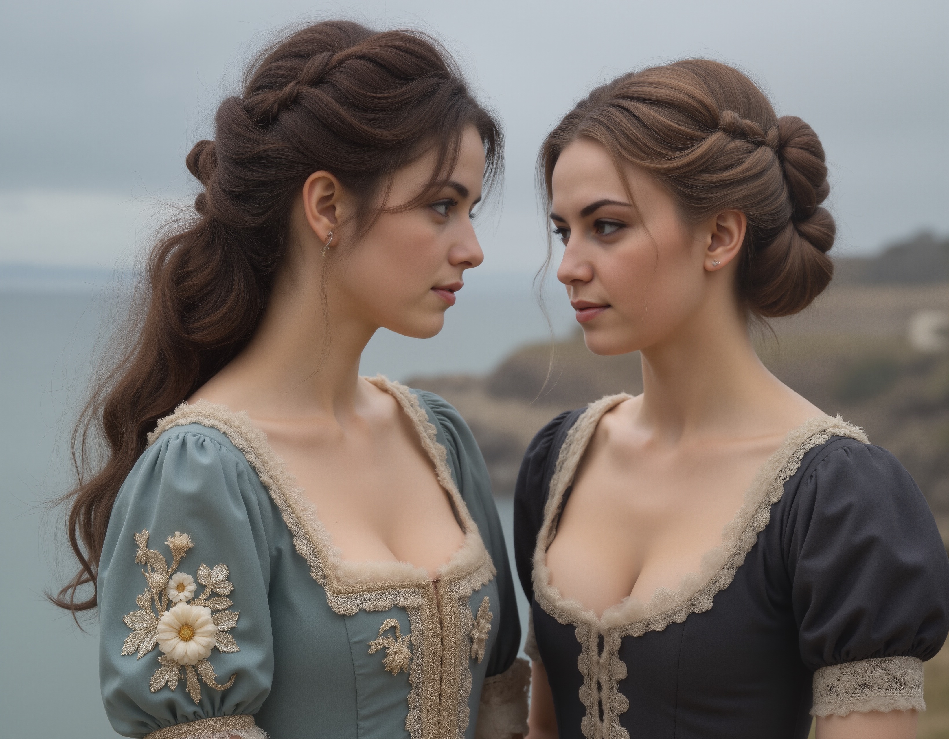 As to prompting: I've also added 'stage-directions', such as 'on the right side of the image'. Still not sure how to control what the two do with their hands, which are more accurate, just busy. Changing 'slender but shapely' for Celeste to 'womanly' and subsequently 'voluptuous' ended up affecting both of them... suddenly Charlotte seems a bit more well-endowed than before.
